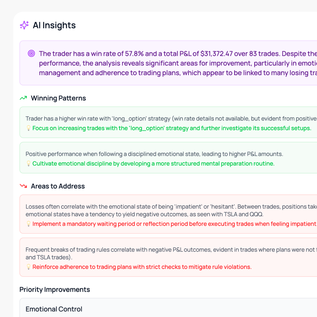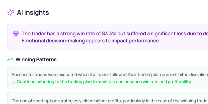 It highlights what is working and what needs attention. The AI does not give financial advice or trading signals. It analyzes your own data to help you improve your process.