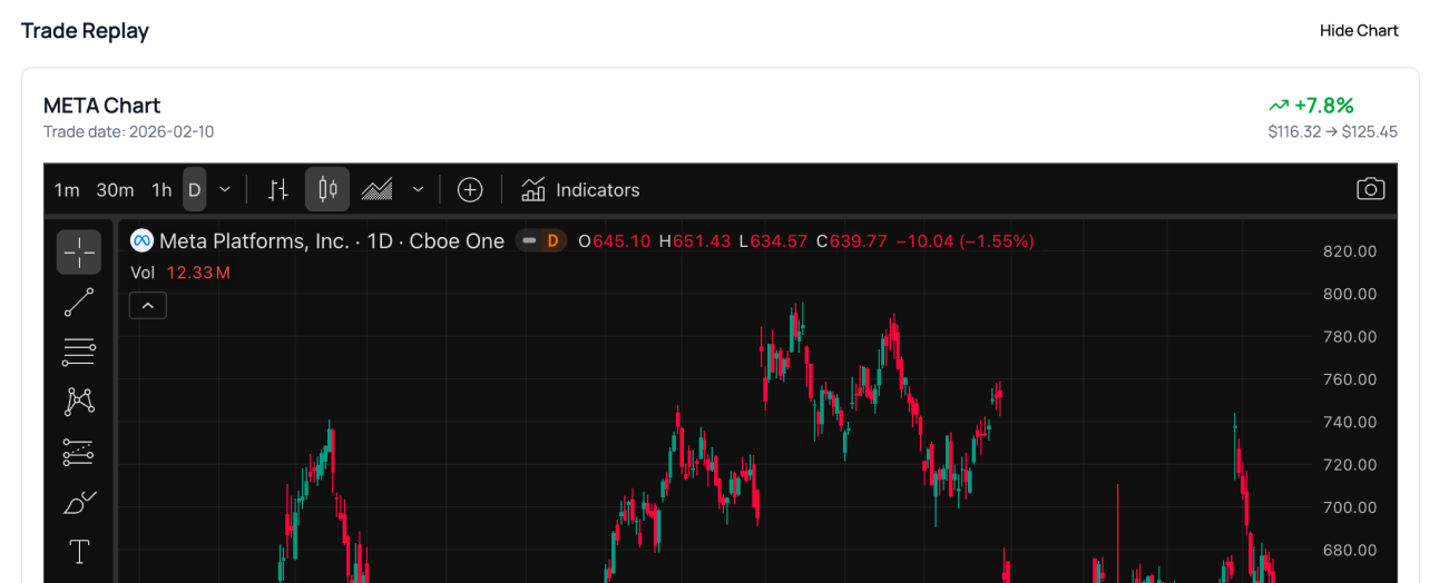 Replay every trade using interactive TradingView charts. Visualize entries, exits, and price action to understand exactly how each setup played out.