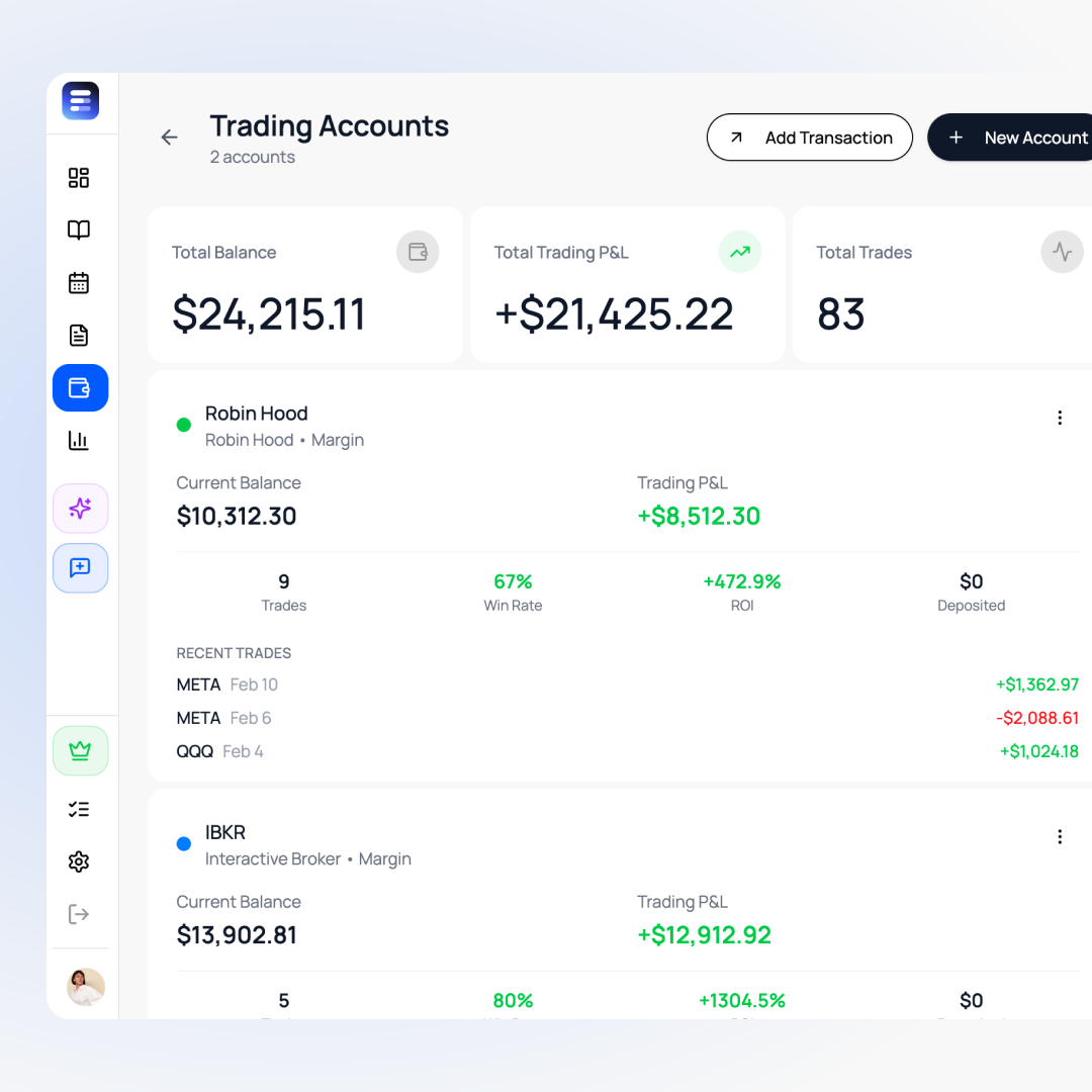 Track and compare multiple brokerage accounts in one trading journal. View combined analytics or break performance down by individual account.