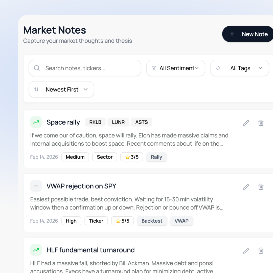 Document trade ideas, tag strategies, rate confidence, and link notes directly to executed trades for organized performance review.